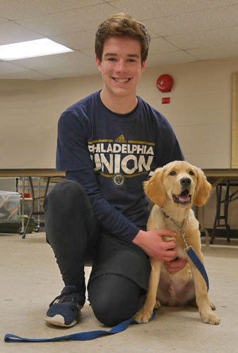 Archer got vested, posing here with Pat and Seeing Eye Area Coordinator,